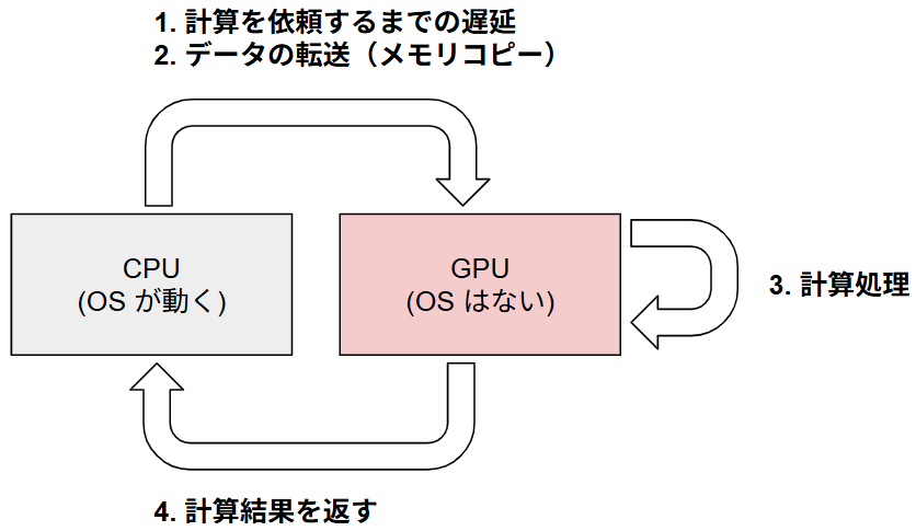 今回指摘する 2 つのボトルネックは、CPU 処理に時間を要してしまうことによる律速作用によって、GPU は次の計算を開始できずに待機してしまうことが GPU をアイドルにさせてしまう最大の原因であることが分かりました。それぞれの具体的なボトルネックについて紹介する前に、GPU 計算で発生し得るオーバーヘッドについて簡単に解説します。GPU 計算で発生するオーバーヘッドはおおまかに以下の4種類に分類されます。計算処理は OS が動作する CPU から始まり、CPU から計算処理を依頼される形で GPU の計算が開始されます。CPU と GPU は独立に動作するため、GPU を常に利用するためには CPU から継続的に計算処理が依頼される必要があります。もし、学習時の各イテレーションにおいて CPU 処理に時間がかかってしまうと、処理依頼待ちで GPU のアイドル時間が増大してしまいます。そのほか、計算処理以外にも、CPU と GPU のメモリは物理的に独立であることに起因するメモリコピーのオーバーヘッドや、計算処理を返すための遅延などが発生します。
