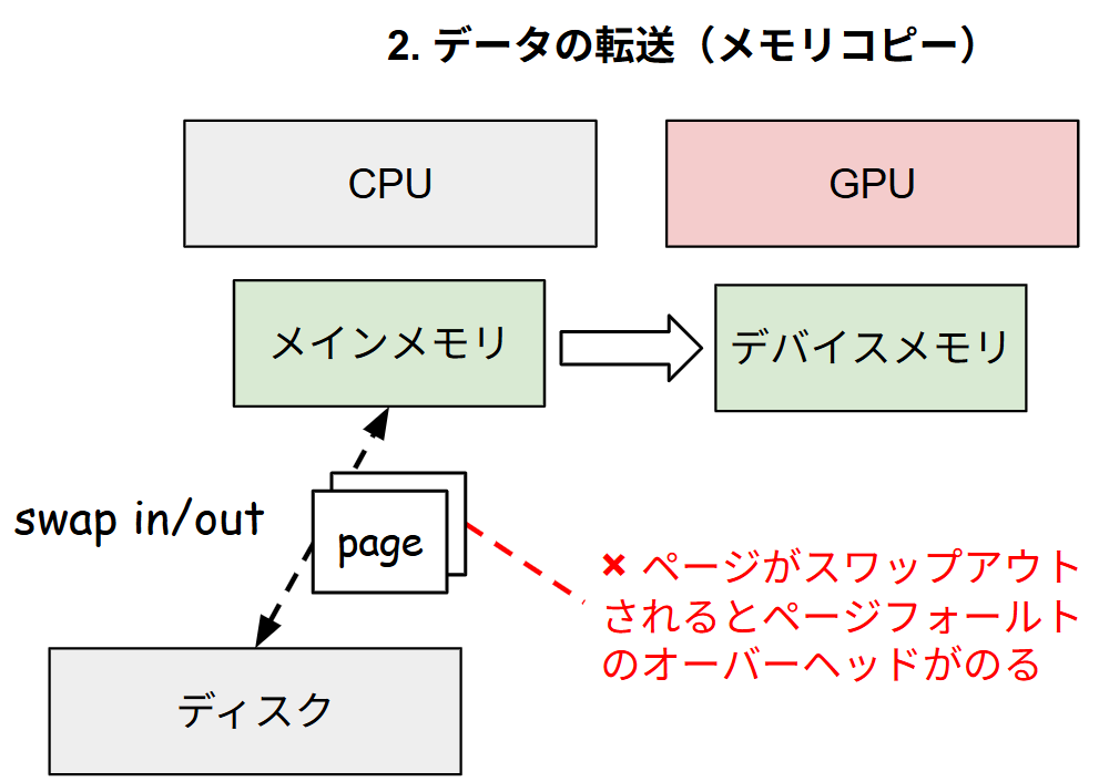 前の節で、GPU 計算で発生するオーバーヘッドの種類について軽く言及しましたが、今回の変更は「2. データの転送(メモリコピー)」部分の高速化に相当します。CPU と GPU は独立したメモリを有しているため、計算処理を実行する前にメインメモリから GPU のデバイスメモリ上にデータをコピーする必要がありますが、この学習に使用しているページが OS によってスワップアウトされないように pinning するのがこのオプションの役割です。