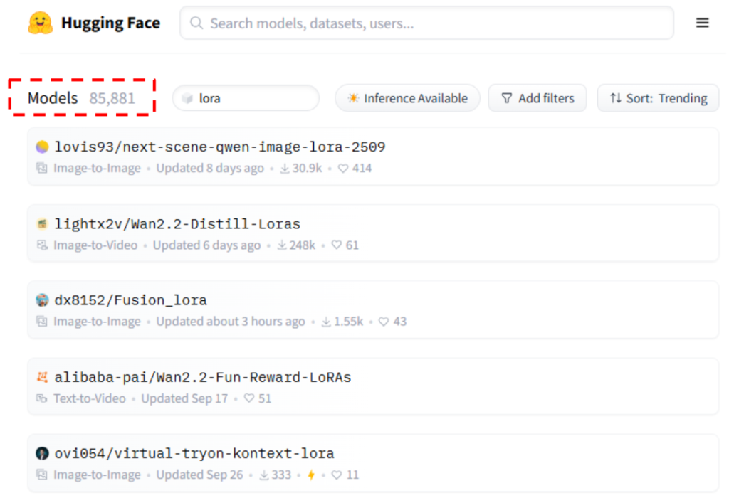 この圧倒的な追加学習効率の良さから、LoRA は広く普及しました。下図に示す通り、Hugging Face [^3] では LoRA の検索結果は 85000 件を超えます(2025年10月時点)。そのほかにも Stable Diffusion Web UI [^4] や kohya_ss [^5] のようなツールを使い、多くのユーザが自身のローカル PC で LoRA の作成・利用を行っています。このように、LoRA は企業だけでなく、一般のユーザにとっても、AI 学習モデルをパーソナライズするための身近な手段となりました。この背景から、ローカル環境での LoRA 学習の効率化は重要な課題と言えます。