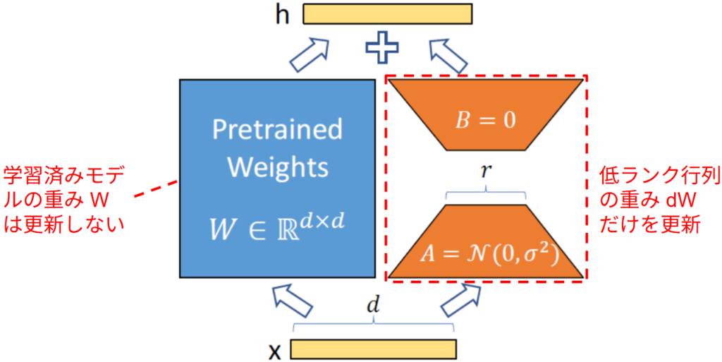 ここで r は d より遥かに小さいランクである(r << d)ため、学習対象は A と B の 2 * d * r 個のパラメータのみとなり、更新量が劇的に削減されます。例えば、d=4096, r=8 の場合、学習すべきパラメータ数を約 1670 万個から約 6.5 万個にまで減らすことができます。