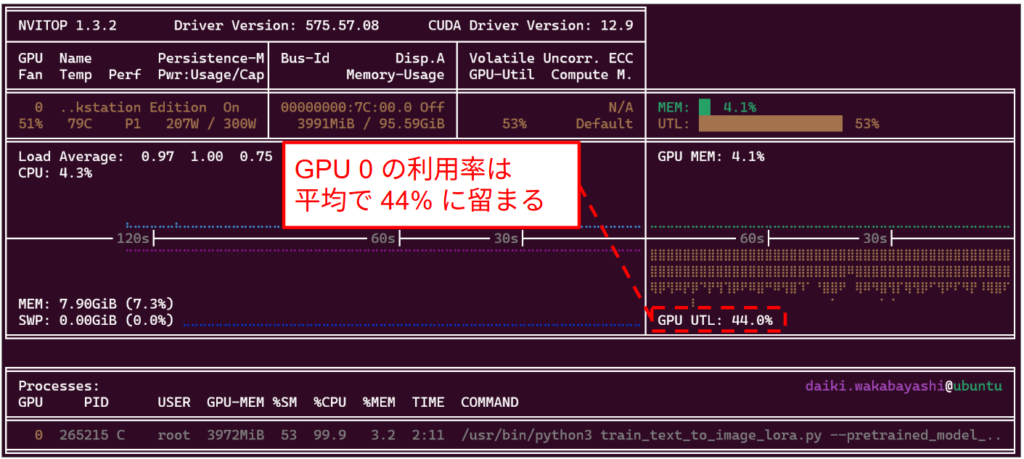 diffusers の train_text_to_image_lora.py [^7]runwayml/stable-diffusion-v1-5 [^8]lambdalabs/naruto-blip-captions [^9]--resolution): 512×512ピクセル--train_batch_size): 1--gradient_accumulation_steps): 4--max_train_steps): 1500--learning_rate): 0.0001 (1e-4)--mixed_precision): fp16下図における nvitop で観測された GPU の稼働状況を確認すると、LoRA 学習ステップ時の平均的な GPU 使用率はわずか 44% 程度であることが分かりました。