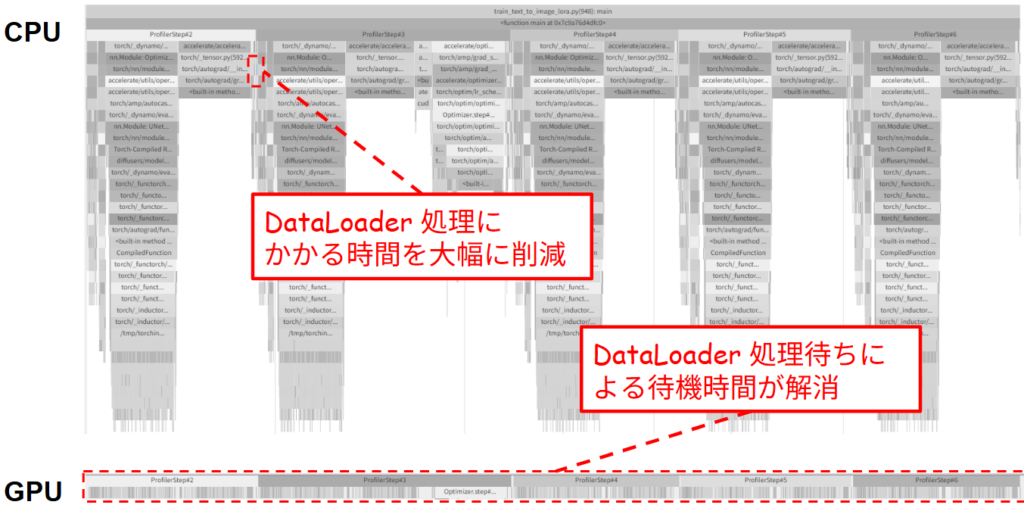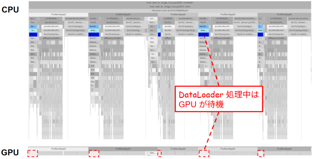 タイムラインの順伝播が始まる前の部分に注目すると、DataLoader 関連の CPU 処理に多くの時間が費やされていることが分かります。ディスクからの画像読み込み、デコード、そしてリサイズや反転といったデータ拡張処理が CPU で行われている間、GPU は次の処理を待機してしまっていることが利用率低下につながっています。これは先程の図中における『1. CPUでの処理』が律速しているケースに該当します。