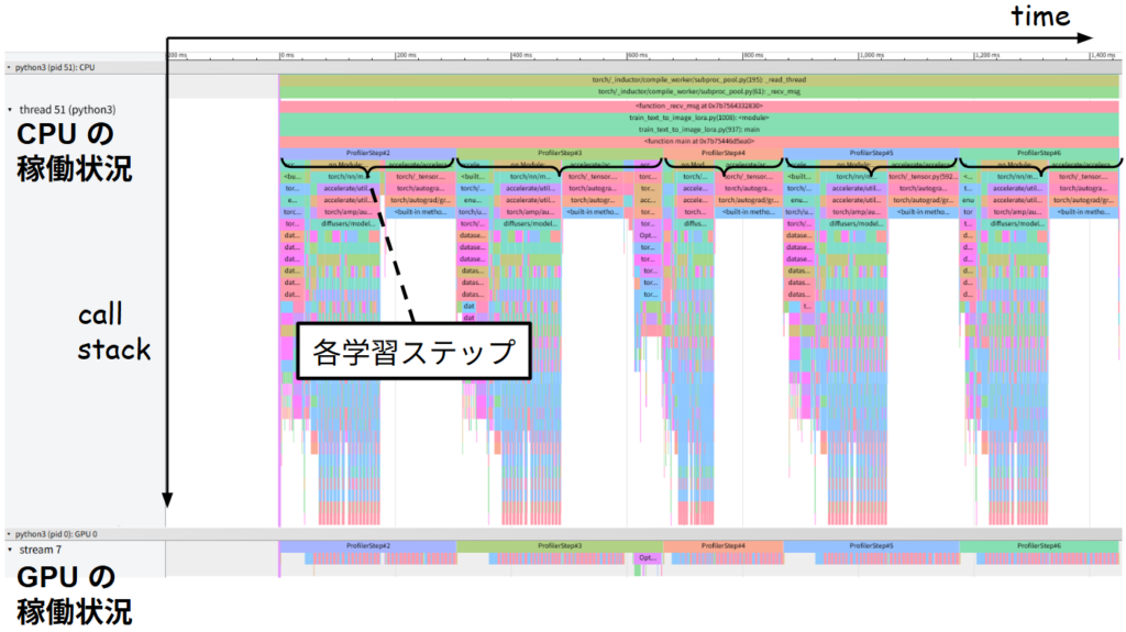 以下が今回得られた実行時のプロファイル結果です。横軸が時間で、左から右に時系列順で実行されている関数が表示されます。perf と併用して利用されることが多い FlameGraph [^12] とは異なり、横軸が時系列順となっている点が嬉しいポイントです(FlameGraph ではアルファベット順などで関数がソートされるため、横軸が重要な意味を持ちません)。このため、関数の実行過程や待ち状態に入るタイミングなどを一目で理解することができます。縦軸は関数のコールスタックを表しており、下の関数ほどコールスタックが深くなっています。perf は CPU プロファイリングに利用されますが、PyTorch Profiler では GPU の稼働状況も合わせたプロファイル結果を表示してくれる点がとても便利です。