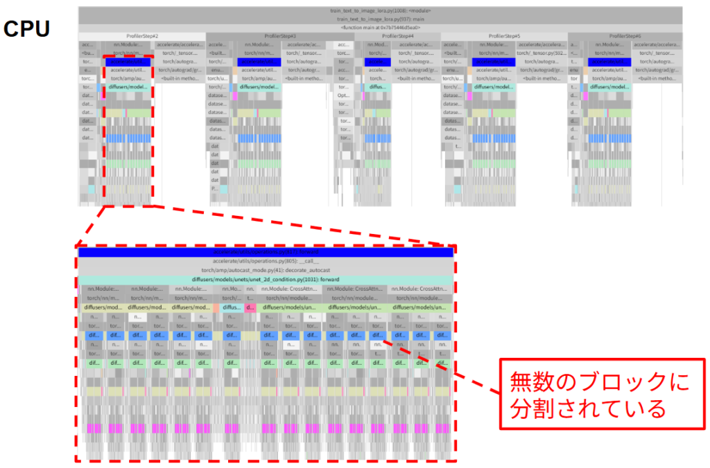 タイムラインの forward ブロックに注目すると、UNet2DConditionModel パスが、nn.Module:CrossAttnDownBlock2D_… や nn.Module:ResnetBlock2D_…といった、非常に小さな処理ブロックに細分化されていることが分かります。forward メソッド内の各サブモジュールを呼び出すたびに、Pythonインタープリタが介在し、命令を出すために CPU-GPU 間での通信が幾多にも発生してしまうことで GPU の待機時間が増大してしまいます。これもボトルネック1と同様に、先程の図中における『1. CPUでの処理』が律速しているケースに該当します。