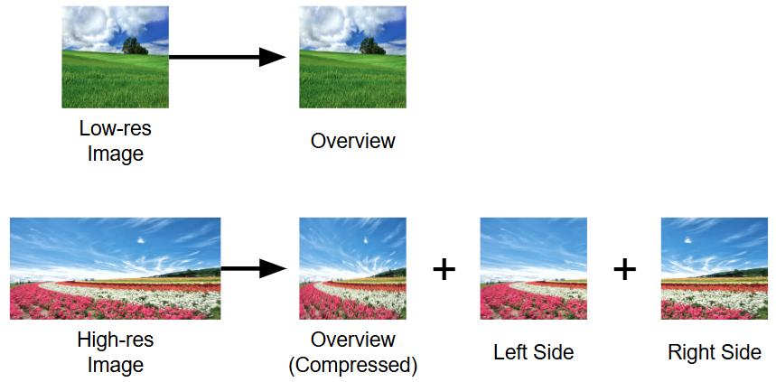 このようなトークン長の変動が生まれる背景には、画像の情報を可能な限り損失なくモデルに伝えるための工夫があります。従来のモデルでは画像を強制的に正方形(例: $224 \times 224$)にリサイズすることが多いですが、これではアスペクト比の崩れや解像度低下により、文字認識や細部の認識精度が著しく低下してしまいます。この問題を解決するため、最新の LMM では下図のように入力画像を動的に分割してエンコードする手法を採用しています。
