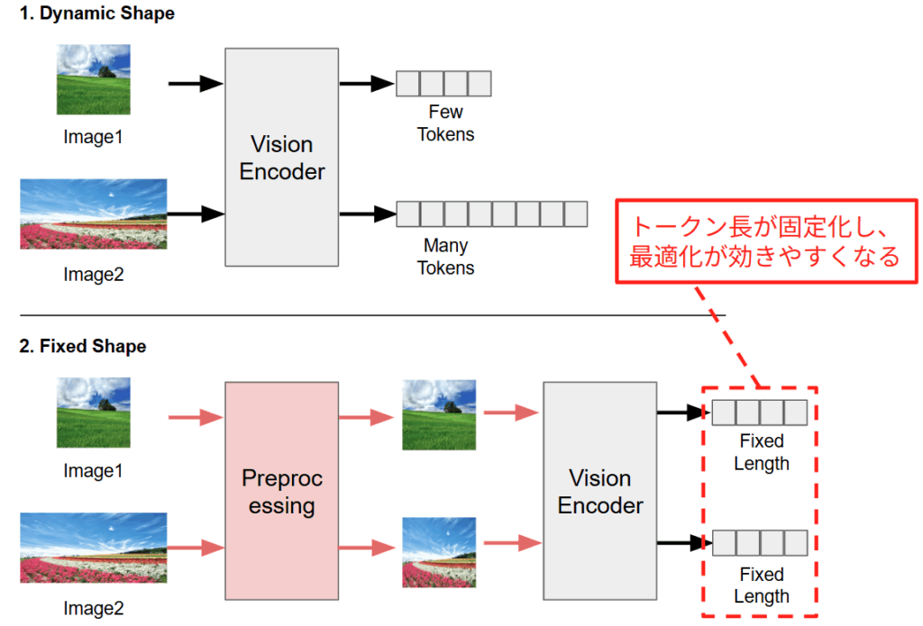 torch.compile の効果が限定的であった最大の要因は、LLaVA-NeXT が採用している AnyRes 機構 [20] による可変長のトークンにあることがわかりました。近年の高性能な LMM は、画像の解像度やアスペクト比に応じて、トークン長を動的に変化させる仕組みを持っています。下図に示すように、解像度の低い画像が入力された場合、Vision Encoder は少数のトークンのみを出力します。一方で、高解像度画像が入力された場合は、詳細を捉えるために大量のトークンが生成されます。使用する画像に応じてトークン長が変化してしまうと、コンパイラはステップごとにこのシェイプ用のカーネルは存在するかということをチェックし、存在しなければ新たなカーネルを生成する再コンパイルを実行してしまうために余計なオーバーヘッドが追加されてしまいます。