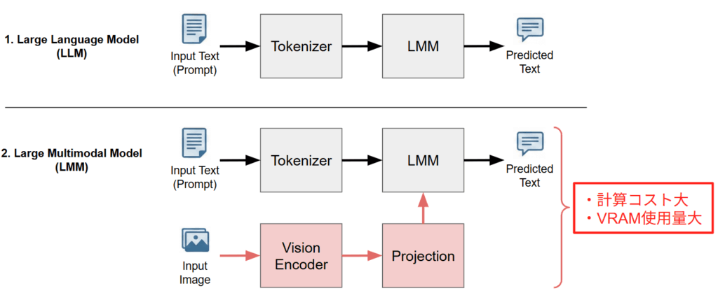 しかし、LMM の学習プロセスには、テキスト単体モデル (LLM) とは根本的に異なる計算リソース上の課題が存在します。下図に示すように、一般的な LLM がテキスト入力のみを Tokenizer を介して処理するのに対し、LMM は画像入力を処理するための独立したパイプラインを持っています。具体的には、高解像度画像を特徴量に変換する Vision Encoder(CLIP [5] や SigLIP [6] など)と、その画像特徴量を言語モデルが理解できる形式に変換する Projection 層が追加されます。