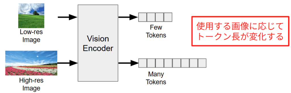 画像を無理に圧縮せず、元の解像度を維持したまま複数のパッチとして扱うことで、画像内の細かな文字情報やテクスチャのディテールを損なうことなくモデルに伝達できます。これにより、文字認識や微細な物体の検出といったタスクにおいて、圧縮に起因する認識精度の低下を根本から回避することができます。一方でこの処理により、例えば $1:1$ の画像と $1:2$ の画像では、Vision Encoder が処理するパッチの枚数が物理的に変化し、結果として LLM に入力されるトークン総数が数倍の規模で変動することになります。