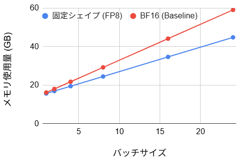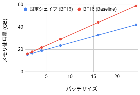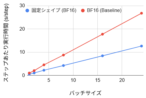 | サイズ固定化 (BF16/FP8) | 40~53% の改善 | 106/57 | 4~29% の改善 | 9.23 | コンパイル時間は長いが、ステップ時間を大幅に削減可能 |