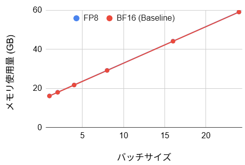 メモリ使用量については理論上期待される半減効果は見られず、ベースラインとほぼ同等の結果となりました。これには大きく 2 つの要因が推測されます。第一に、新旧の重みが一時的に重複してメモリに確保されている可能性です。今回は LoRA 適用後にレイヤを置換する手法を採用しているため、管理用メタデータや重複領域がメモリを圧迫していると考えられます。第二に、前段で述べた技術的制約により Vision Encoder が FP8 化できていない点です。ここが依然として BF16 レイヤとしてメモリを消費し続けているため、LLM 部分での削減効果が相殺され、結果としてメモリ総量に変化が現れなかったと考えられます。