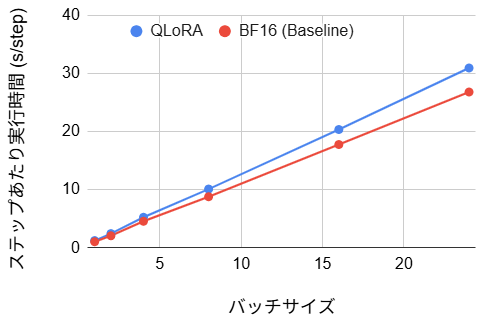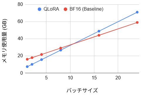 | QLoRA | 15~19% の悪化 | 1.69 | バッチサイズ1で53% の改善、バッチサイズ24で20% の悪化 | 8.88 | 小バッチサイズでは使用メモリは大幅に削減されるが、実行時間が増加 |