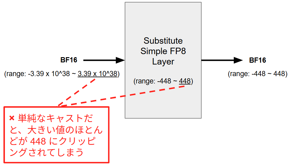 まず、オーバーフローの問題について説明します。BF16 での値域はおよそ $-3.39 \times 10^{38} \sim 3.39 \times 10^{38}$ ですが、FP8 (E4M3) の値域はわずか $-448 \sim 448$ です。このため、そのまま BF16 の値を FP8 にキャストしてしまうと、大きな値は 448、小さな値は -448 に張り付いてしまいます。このため、例えば本来 1,000、1,000,000 といった差があった重みがキャストした瞬間に同じ 448 として扱われてしまいます。これではネットワークは特徴の強弱を学習することができません。