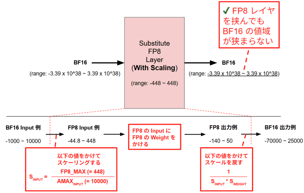 以下の具体例を用いて説明します。ここでは入力となる BF16 テンソルが $-1000 \sim 10000$ の範囲に分布しているケースを想定します。このままキャストすると FP8 の最大値 448 を超えてしまいますが、入力の絶対最大値(AMAX=10000)を用いてスケーリング係数 $S_{INPUT} = \frac{448}{10000} = 0.0448$ を算出します。この係数を乗じることで、入力データは $-44.8 \sim 448$ という FP8 で表現可能な範囲に圧縮されます。FP8 空間で行われた演算結果には、逆変換の係数($1 / (S_{INPUT} \times S_{WEIGHT})$)が乗じられ、最終的な出力は $-70000 \sim 25000$ といった本来の BF16 スケールへと復元されます。これにより、内部計算は高速な FP8 で実行しつつ、モデル全体としては BF16 相当のダイナミックレンジを維持することが可能になります。
