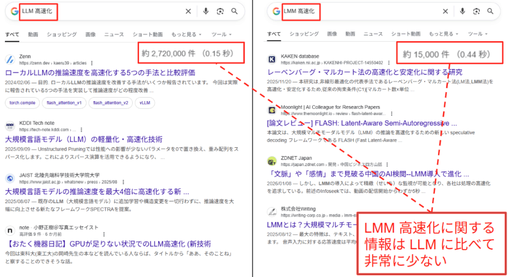 LMM の学習には最適化が不可欠であるにもかかわらず、そのベストプラクティスについてはブラックボックスとなっている部分が大きいです。LLM では、量子化や torch.compile [7] といった高速化手法が標準化されつつあります。しかし、LMM は Vision Encoder という追加のモジュールを内包しており、データフローやメモリアクセスのパターンが LLM よりも複雑です。そのため、LLM で劇的な効果を上げた手法が、LMM においても同様に機能するのか、あるいはボトルネックとなってしまうのかが自明ではありません。下図は LLM/LMM 高速化に関する Google 検索の結果画面ですが、LLM に比べて LMM の高速化手法は一般に周知されていないことが分かります。