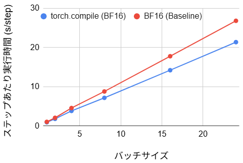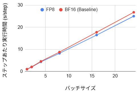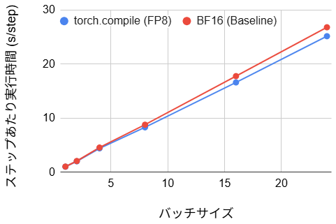 ステップあたりの実行時間は、ベースラインと比較して約 50% 程度の削減を達成しました。これは動的シェイプという制約が外れたことで、コンパイラが本来の最適化能力を発揮し、カーネルの統合が効率的に行われた結果と言えます。BF16 の場合、初期コンパイルに 106 秒のオーバーヘッドが発生しますが、バッチサイズ1の場合の損益分岐点は約 220 ステップです。実用的な学習は通常数千ステップ以上に及ぶため、初期の待ち時間を投資する価値は十分にあるといえます。FP8 ではさらに初期ステップ時間が短くなり、損益分岐点は約 135 ステップとなるため、ステップ数が 135~220 の場合には FP8 が有用と言えます。
