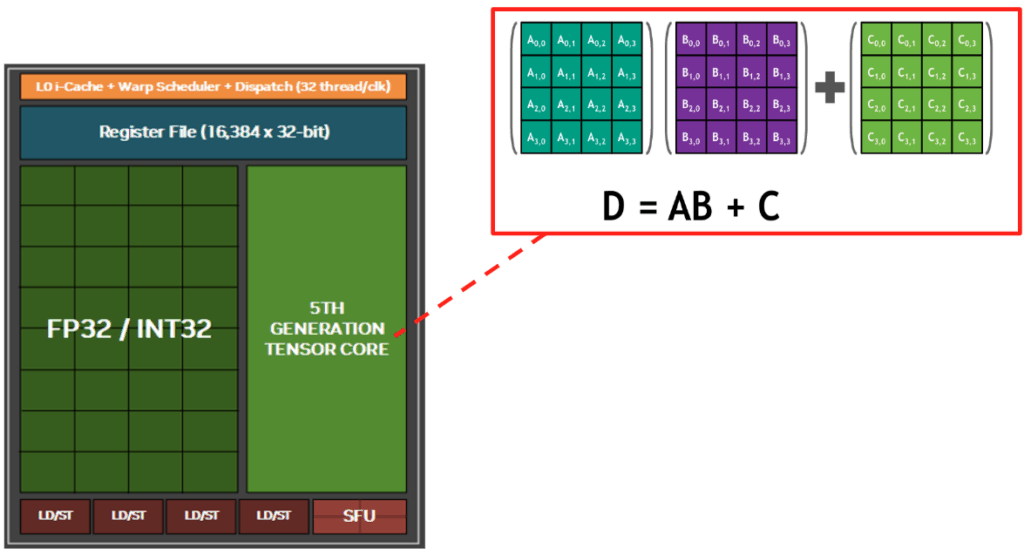 さらに、最新の Blackwell アーキテクチャには、行列演算を物理層で加速する 第 5 世代 Tensor Core [14] が搭載されています。通常の CUDA コアが 1 クロックごとに 1 つの数値計算を順次処理するのに対し、Tensor Core は行列積和演算($D = A \times B + C$) に特化した専用回路であり、1 クロックで $4 \times 4$ などの行列計算を一括して並列処理します。Blackwell の第 5 世代 Tensor Core は FP8 演算をネイティブにサポートしており、BF16 と比較して 2 倍の演算スループット を実現します。これは、データサイズが 16 ビットから 8 ビットに半減したことで、Tensor Core 内部のパイプラインに一度に投入できるデータ量が 2 倍になるためです。単にメモリ容量を節約できるだけでなく、2倍のデータを一度に計算できるハードウェア特性を活かすことができるようになります。