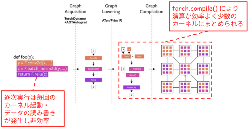この非効率な逐次実行を解消するために、torch.compile は実行前にプログラム全体の流れを解析します。図の中央に示されるように、TorchDynamo が Python コードから Computational Graph を抽出します。さらに、BatchNorm のような複雑な演算を、より基本的な計算単位へと分解・正規化します。これにより、コンパイラは計算の細部までを把握し、最適化の余地を見つけ出せるようになります。解析された計算の流れに基づき、複数の演算を一つにまとめます。図の右端にあるグリッドは、統合されたカーネルを表しています。内部に橙・桃・紫の 3 色が詰まっているのは、本来別々だった「畳み込み」「正規化」「活性化」の工程が、一つのカーネルに統合されたことを示しています。これにより、GPU は一度のカーネル起動で一連の計算を一気に処理できるようになります。中間データを VRAM に書き戻す必要がなくなるため、データ移動の無駄を排除した極めて効率的な実行が可能となります。