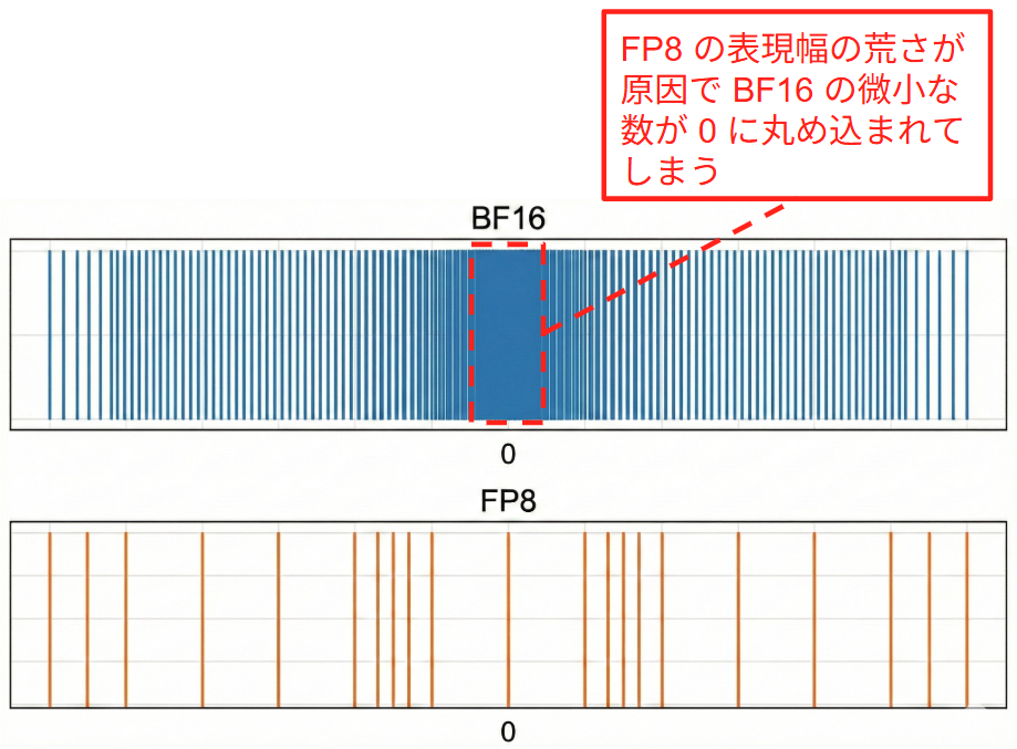 また、微小な数のキャストについてもアンダーフローというもう一つの落とし穴が存在します。FP8 の最小表現幅は BF16 よりもずっと荒いため、BF16 で表現できていた 0.00005 のような重みが FP8 では 0 とみなされてしまいます。学習において重みや勾配の微調整は重要になりますが、そのままキャストするとこれらがすべてゼロとみなされて学習が止まってしまいます。